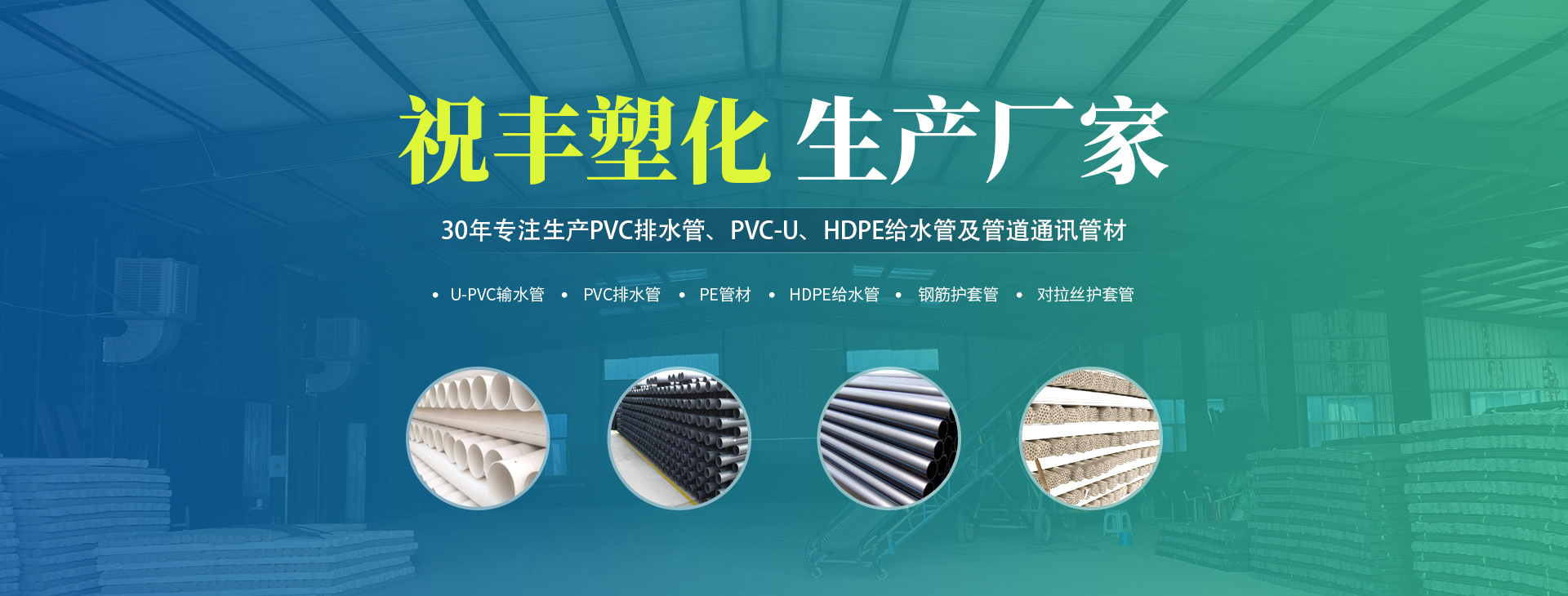 安陽(yáng)市祝豐塑化有限公司坐落在滑縣工業(yè)園區(qū),東臨大廣高速,西臨京珠高速,是鄭州、鶴壁、安陽(yáng)、濮陽(yáng)四個(gè)城市的輸紐,交通便利、環(huán)境優(yōu)美。       公司始建于八十年代,經(jīng)過(guò)二十余年的艱辛創(chuàng)業(yè),規(guī)模不斷壯大,由十多萬(wàn)元資產(chǎn)的小廠,發(fā)展到現(xiàn)占地面積達(dá)一萬(wàn)多平,建筑面積一萬(wàn)平,資產(chǎn)2000多萬(wàn)元管材生產(chǎn)企業(yè)。公司生產(chǎn)PVC-U、PVC排水管、HDPE給水管、鋼筋護(hù)套管管道通訊管材等產(chǎn)品,廣泛用于農(nóng)田節(jié)水、高山引水、人畜用水、建筑、電力通訊等多種用途,品種齊全。為了滿足用戶需求,可承攬各種給水、節(jié)水、灌溉工程。“祝豐塑化”憑借強(qiáng)勁的實(shí)力,優(yōu)良的管理水平。“以質(zhì)量求生存,以信譽(yù)求發(fā)展”的原則全力以赴和大家共同塑造美好未來(lái)。..